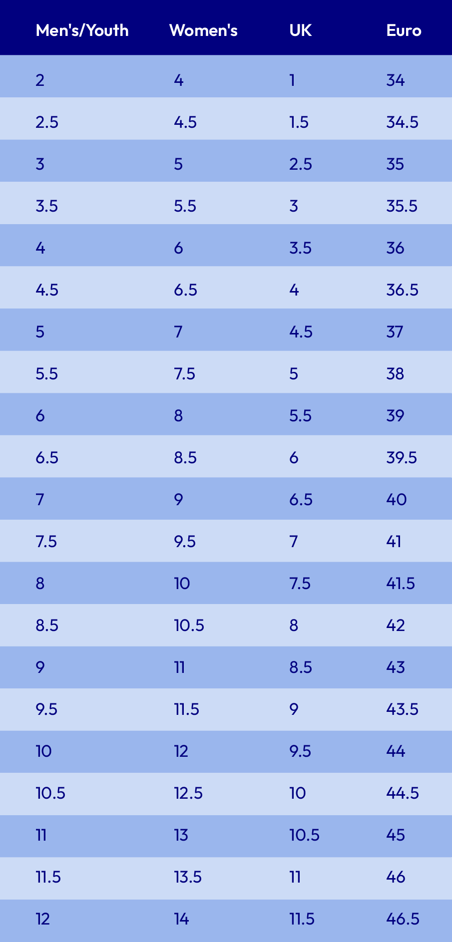 - Men’s 12 → Women’s 14