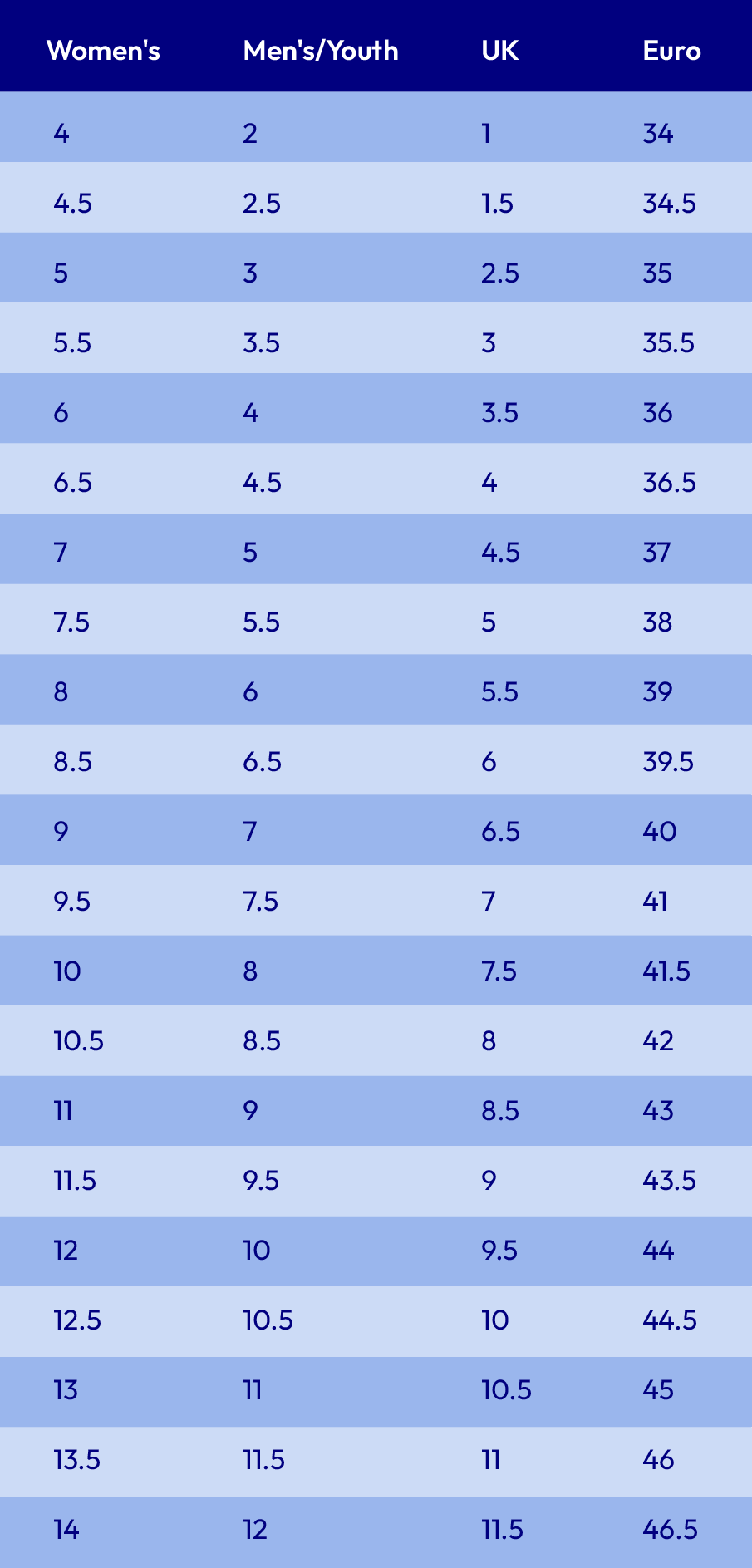 Tip: If switching to men’s shoes and you have narrow feet, go half a size down for a better fit (only for width, not length).
