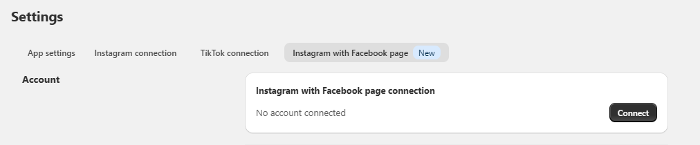 - Go to Instagram with Facebook page tab in Settings, click Connect: