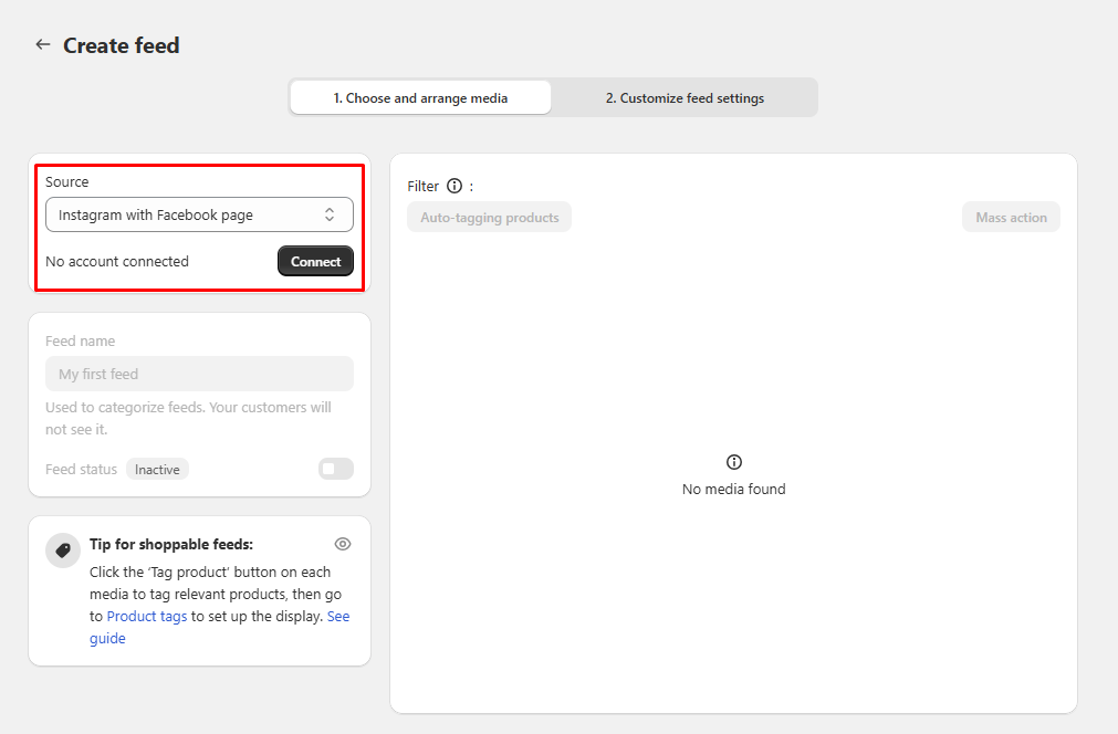 - In the feed creation modal, please choose the Instagram with Facebook Page source and click Connect.