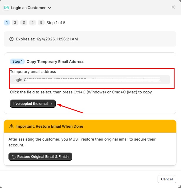 You will see a screen showing the temporary email and a button “I’ve copied the email”.