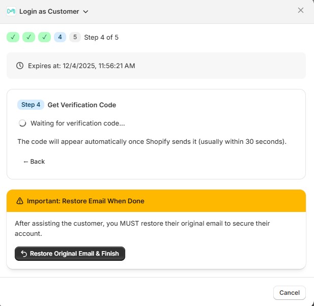 The app will automatically collect the verification code as soon as Shopify sends it.
