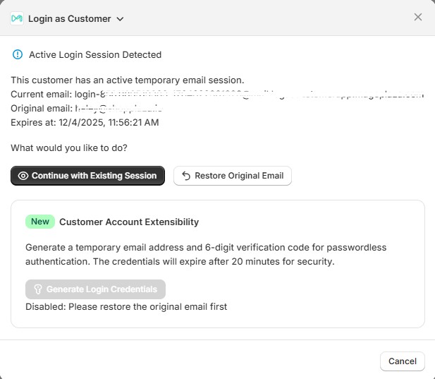 If you start a new impersonation session for a customer who already has an active temporary email, the app will notify you.
