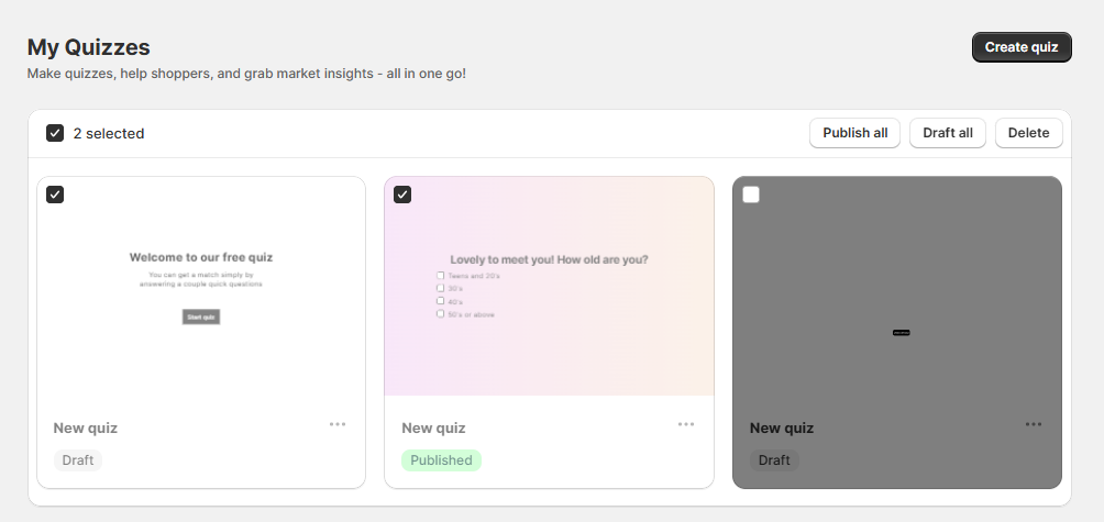 - Publish all – Publish selected quizzes to your store.