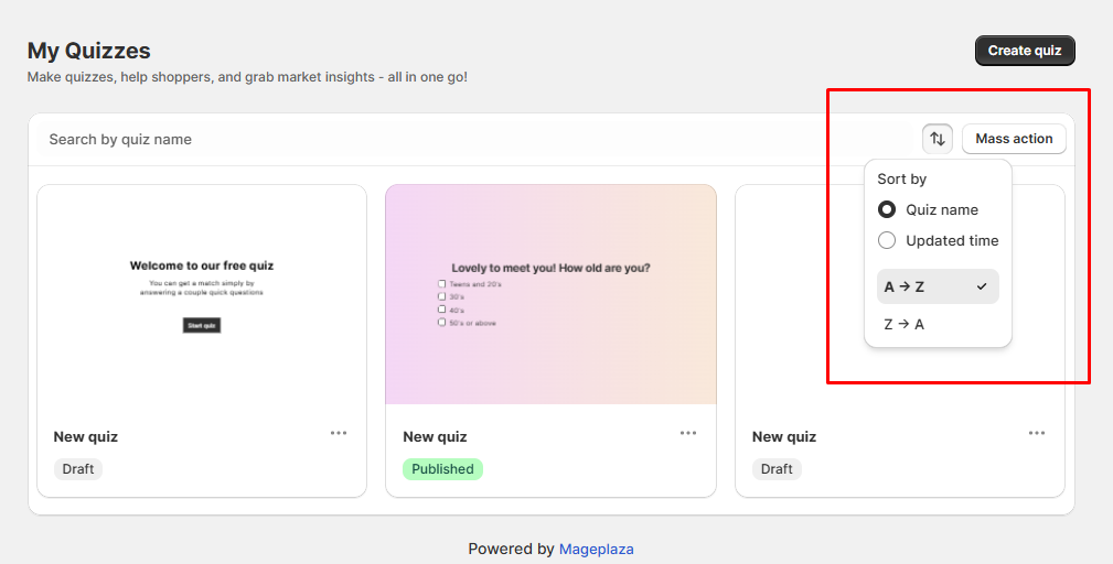 - Sort: Click the sort icon to arrange quizzes by name (A → Z or Z → A) or by last update time.