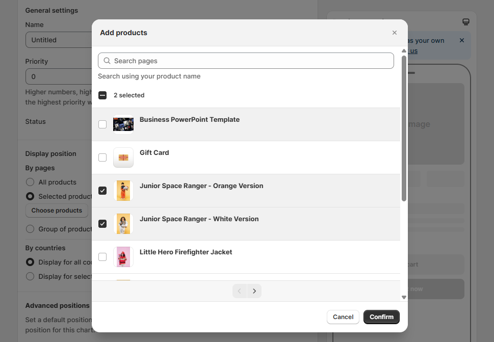 Choose Selected products if you only want to assign the chart to specific items. Click the Choose products button → a pop-up will display all products in your store. You can search for products and check the ones you want to assign to the chart. Finally, click Confirm to complete.