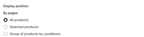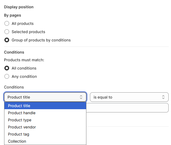 The Display position settings let you control how a size chart is applied across your store. You can show it on all products, assign it to specific items, or use condition-based rules (tags, collections, product types, etc.) to display charts only where they’re most relevant.